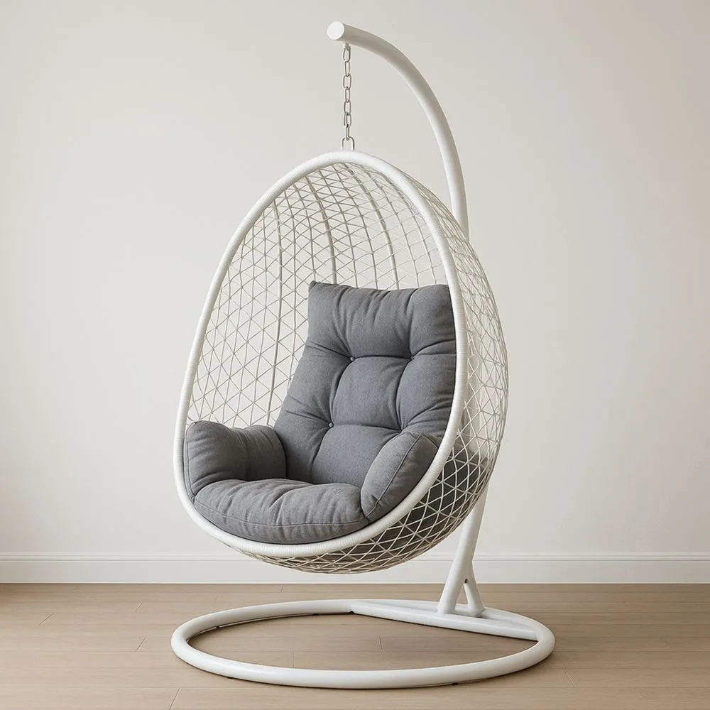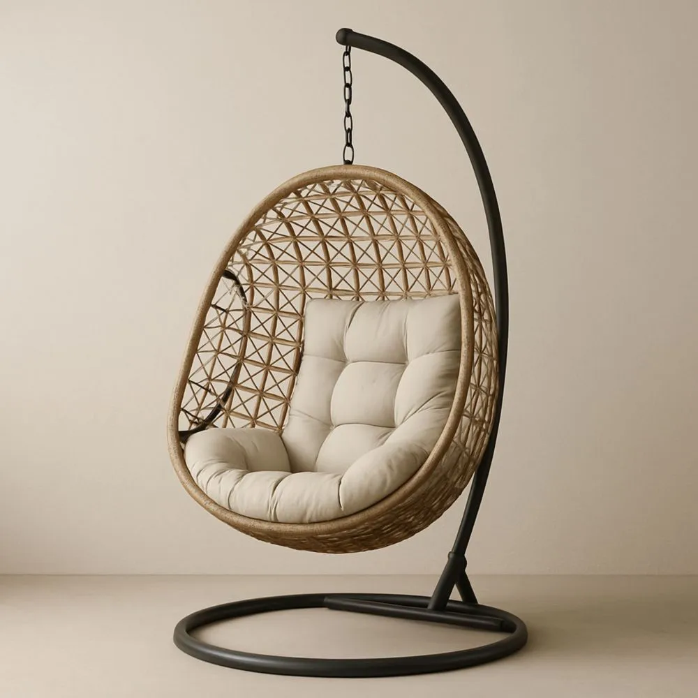 Stabiler Hängesessel mit eigenem Gestell – kein Deckenhaken nötig. Ideal für Wohnzimmer, Balkon oder Terrasse.